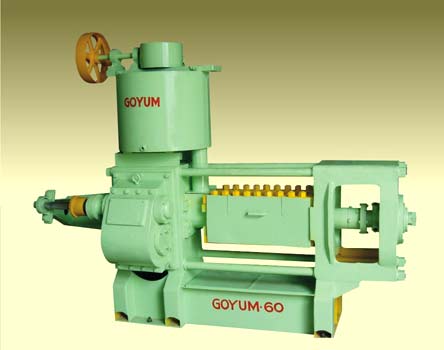 The main body and base of the Goyum 30 are made out of high grade, quality steel. It has a triple reduction gear box with helical gears and a cast steel chamber of four sections. The sizes of the chamber are as follows: 4 inches diameter x 26 inches long. The worm assembly is case hardened to ensure it withstands heavy loading, which results in a superior quality of oil and cake. The thickness of the cake can be adjusted while running. This machine takes less installation space than normal machines, is easy to use and requires very little maintenance.